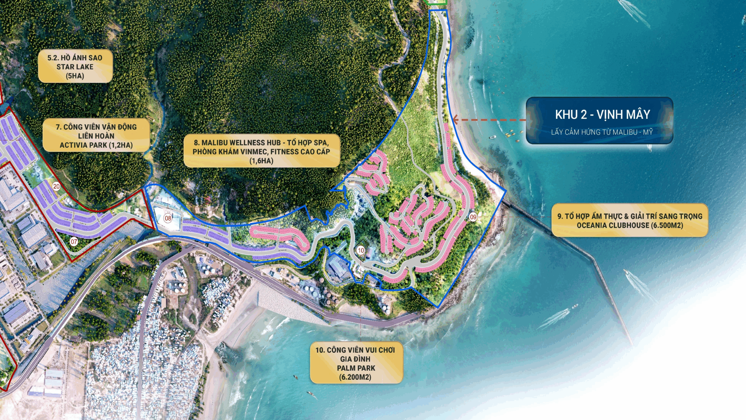 Khu 2 – Phân khu Vịnh Mây, lấy cảm hứng từ Malibu Mỹ. Một trong những phân khu đẹp nhất dự án với số lượng chỉ 700 căn nhà phố thấp tầng, có tầm view biển Đà Nẵng trọn vẹn, đem lại nhiều nguồn năng lượng tích cực cho cư dân cũng như khách hàng khi tới sử dụng.